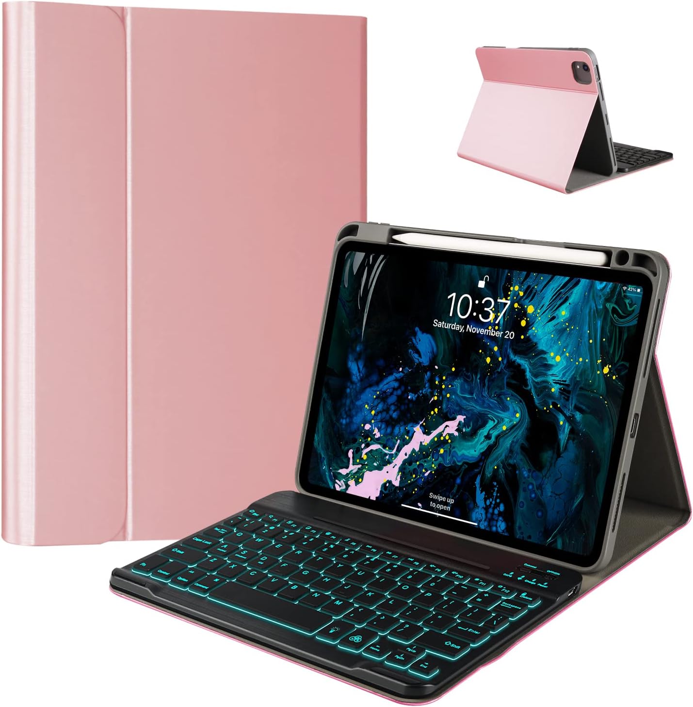 iPad Pro 11 Inch Case with Keyboard 2021/2020, iPad Air Case 4th Generation Keyboard with Pencil Holder, Detachable Wireless Keyboard 7 Colors Backlit - Flip Stand Leather Smart Cover - Pink